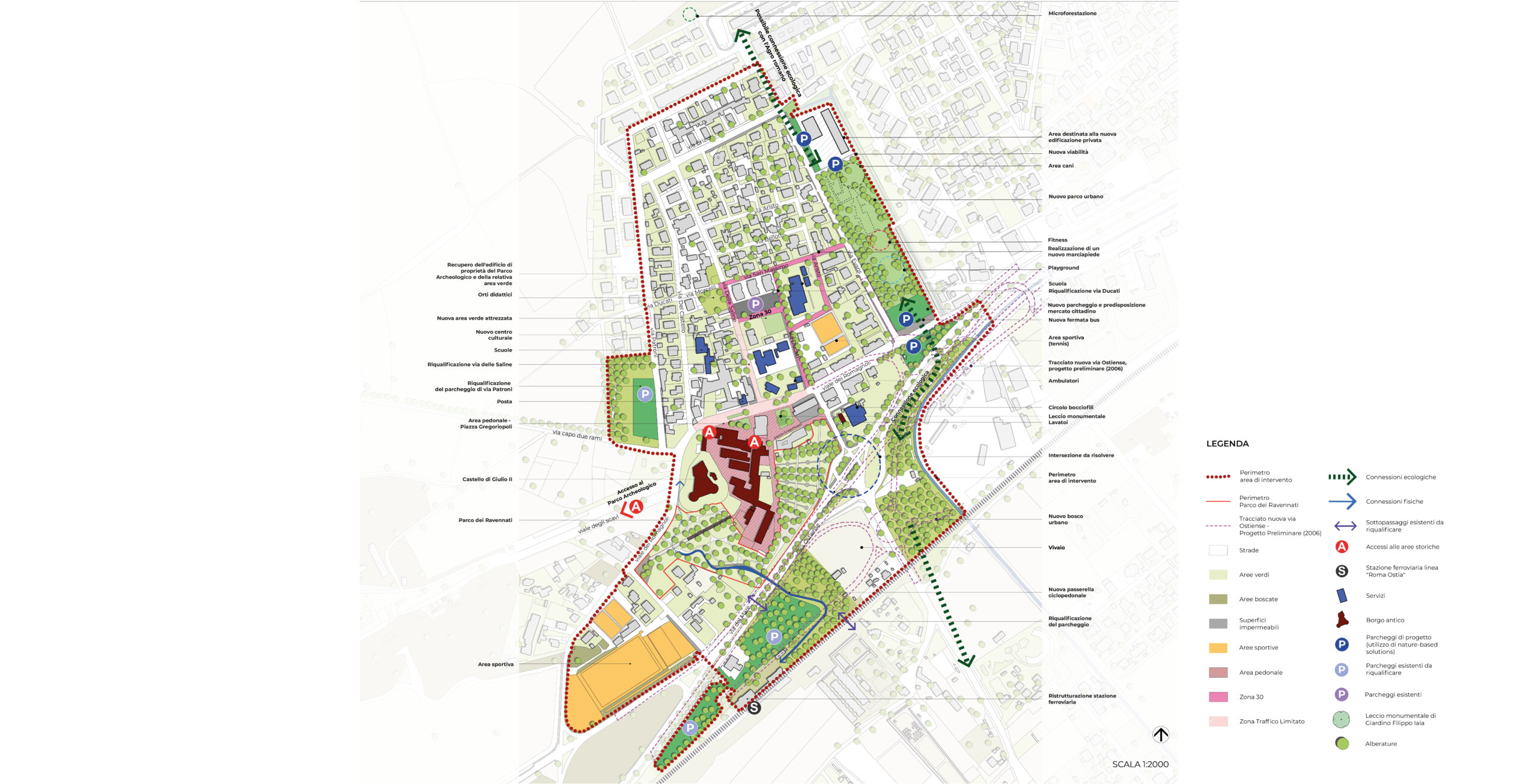 Il progetto prevede la riqualificazione del parcheggio della stazione con superfici drenanti, incremento delle alberature e una nuova passerella ciclopedonale inclusiva verso il Parco dei Ravennati, la creazione di Piazza Gregoriopoli come nuova centralità urbana con la valorizzazione del leccio monumentale e la pedonalizzazione di parte del centro, la realizzazione di un parco urbano di 20.000 mq in via Evans con aree per il gioco, il fitness, il mercato, eventi all’aperto, giardini tematici, zona umida e spazi per la biodiversità. Sono previsti anche interventi di microforestazione e orti didattici, nuove aree verdi attrezzate e l’estensione delle zone 30 per favorire la mobilità dolce.